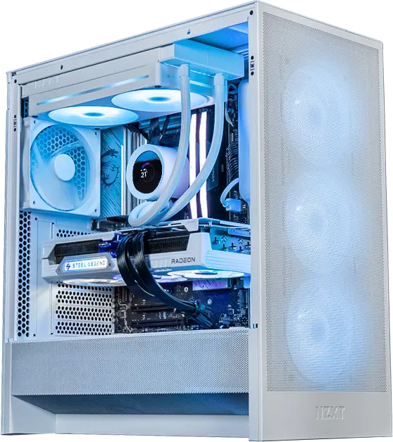 PC Frost by NZXT. Même GPU, même RAM, même SSD. Mais dans une tour plus sobre. Ryzen 7 7800X3D. C’est la config “clean” pour jouer longtemps, avec zéro bruit et zéro chauffe.