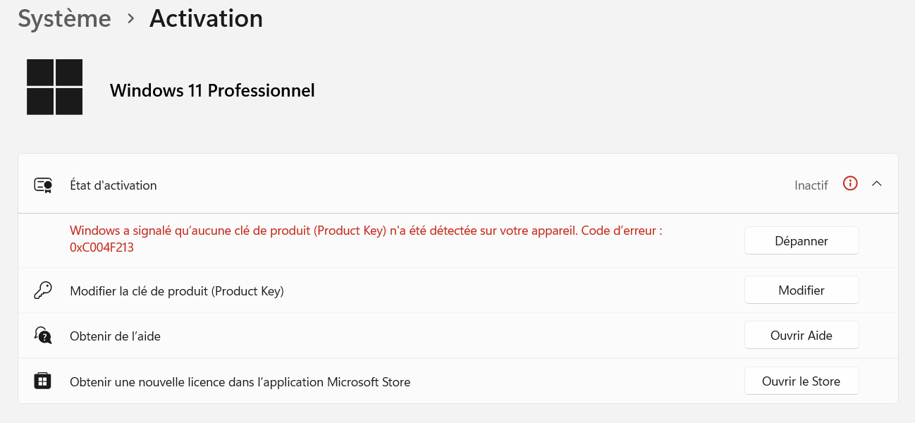 - Windows a été installé sans clé produit (très courant sur un PC neuf assemblé).