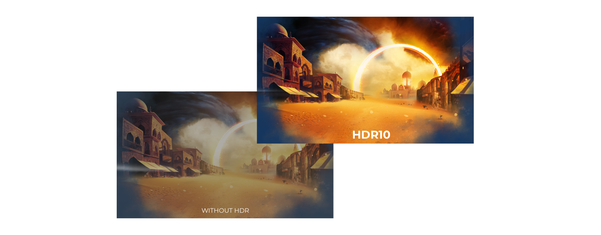HDR10 est là pour améliorer encore davantage la qualité d'image, en améliorant la synchronisation de votre GPU ou de votre console avec le moniteur. Cela crée une expérience de jeu plus réaliste, immersive et fluide : Vous aurez l'impression de vous plonger dans le jeu, image par image.